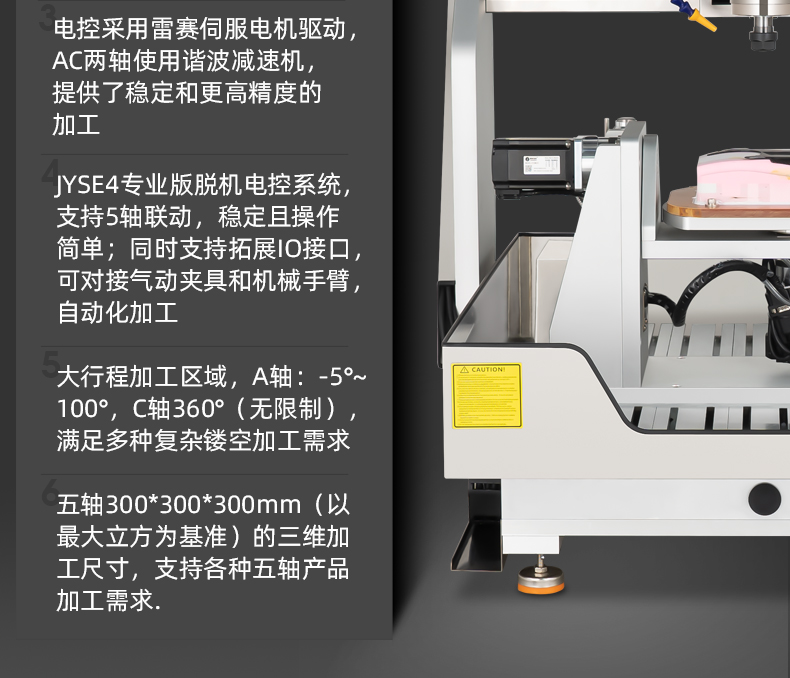 晶研桌面款搖籃五軸精雕機(jī),采用昌盛2.2KW水冷主軸,內(nèi)循環(huán)水冷系統(tǒng),干凈環(huán)保。配置C7級滾珠絲桿和H級直線導(dǎo)軌,運(yùn)行順滑。雷賽伺服電機(jī)驅(qū)動,AC兩軸諧波減速機(jī),高精度加工。JYSE4脫機(jī)電控系統(tǒng),支持5軸聯(lián)動和自動化加工。大行程,A軸-5°~100°,C軸360°,五軸300×300×300mm加工尺寸,滿足復(fù)雜鏤空及多種產(chǎn)品加工需求。