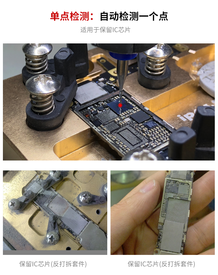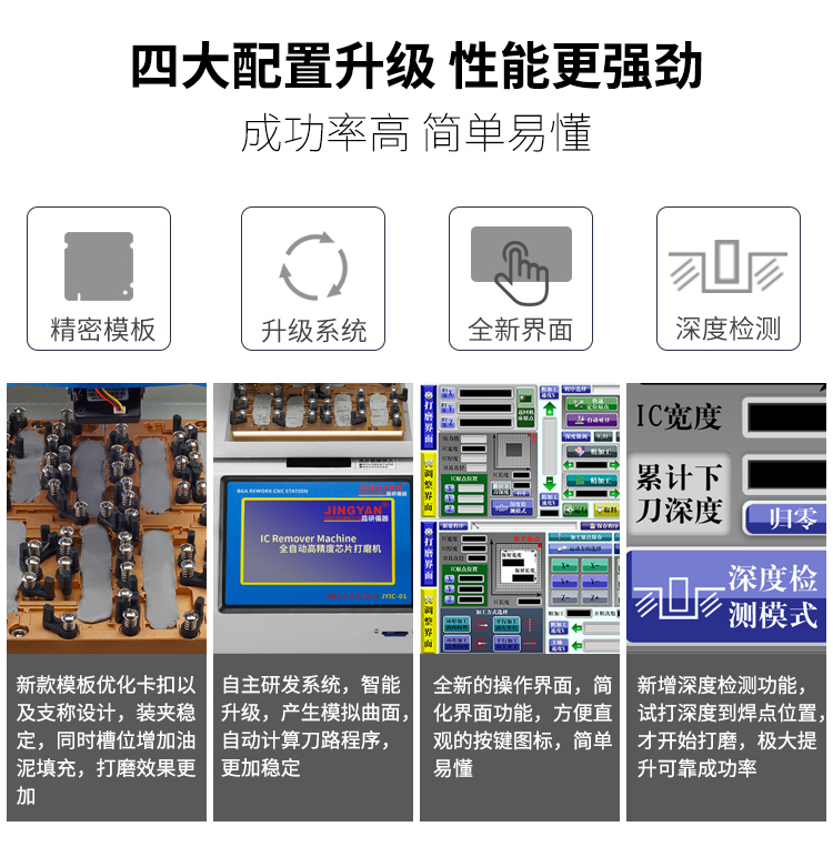 晶研智能BGA芯片拆除機(jī)是由東莞市晶研儀器科技有限公司獨立研發(fā)的全自動BGA芯片維修平臺,配合相應(yīng)高精度定制模具可對各種類型的IC芯片進(jìn)行拆除或者打磨,效果優(yōu)秀。晶研智能BGA芯片拆除機(jī)采用進(jìn)口耗材,整機(jī)的裝配都經(jīng)過嚴(yán)格的把關(guān)。拆除機(jī)以其獨有的平面度檢測功能使得打磨變形的BGA主板更加精確簡單。