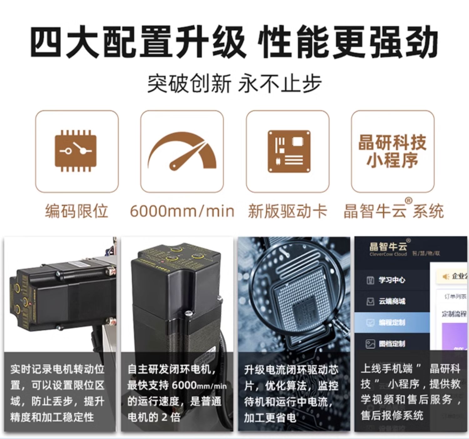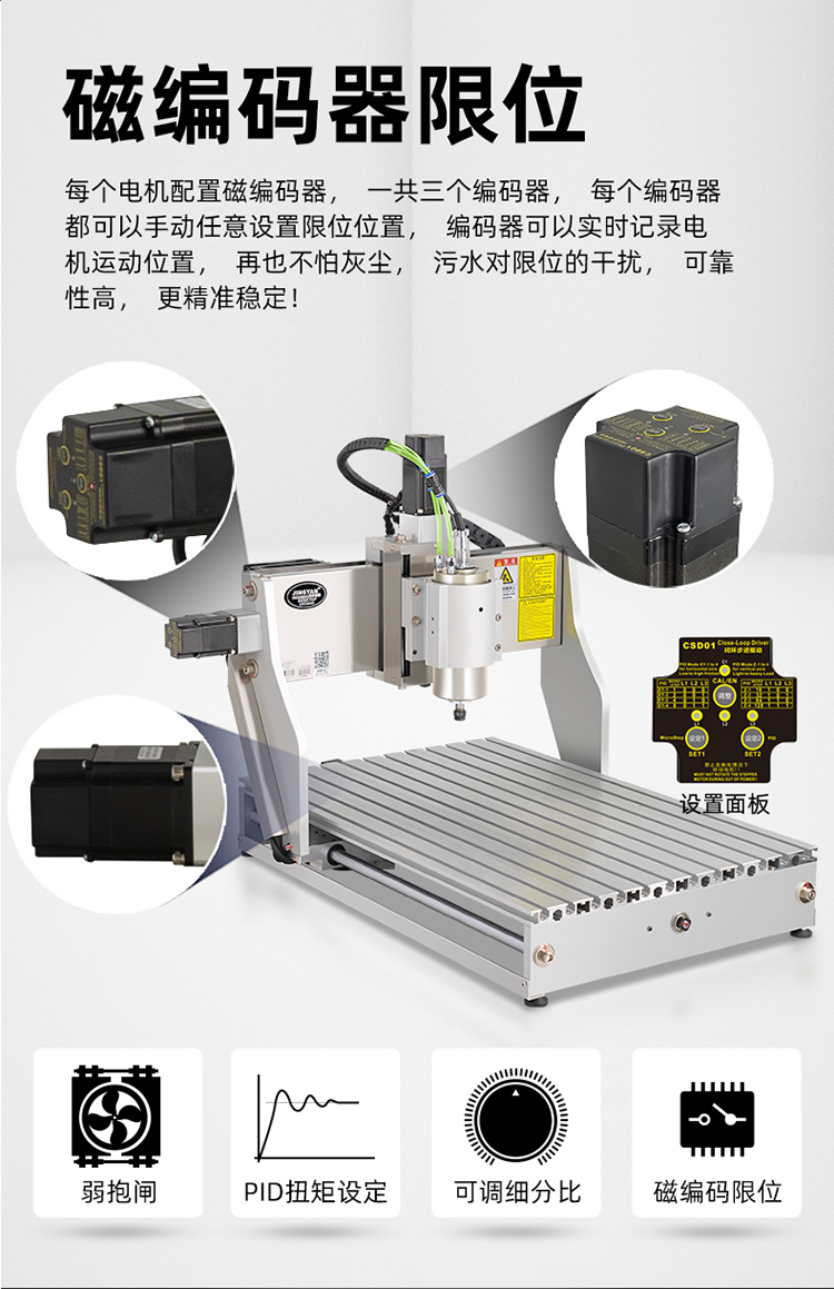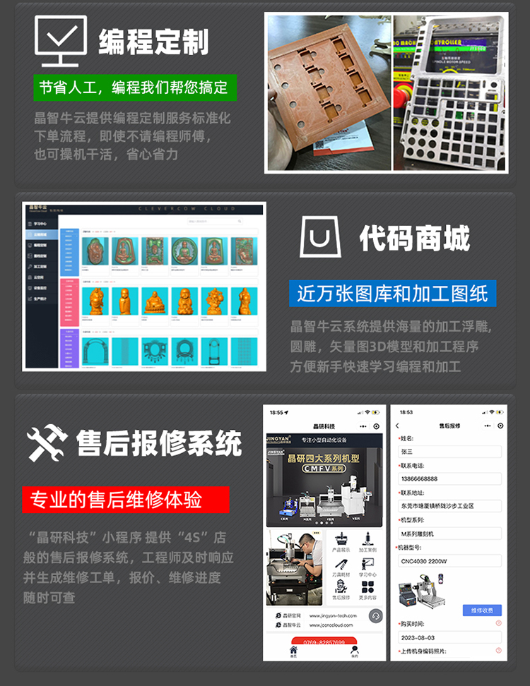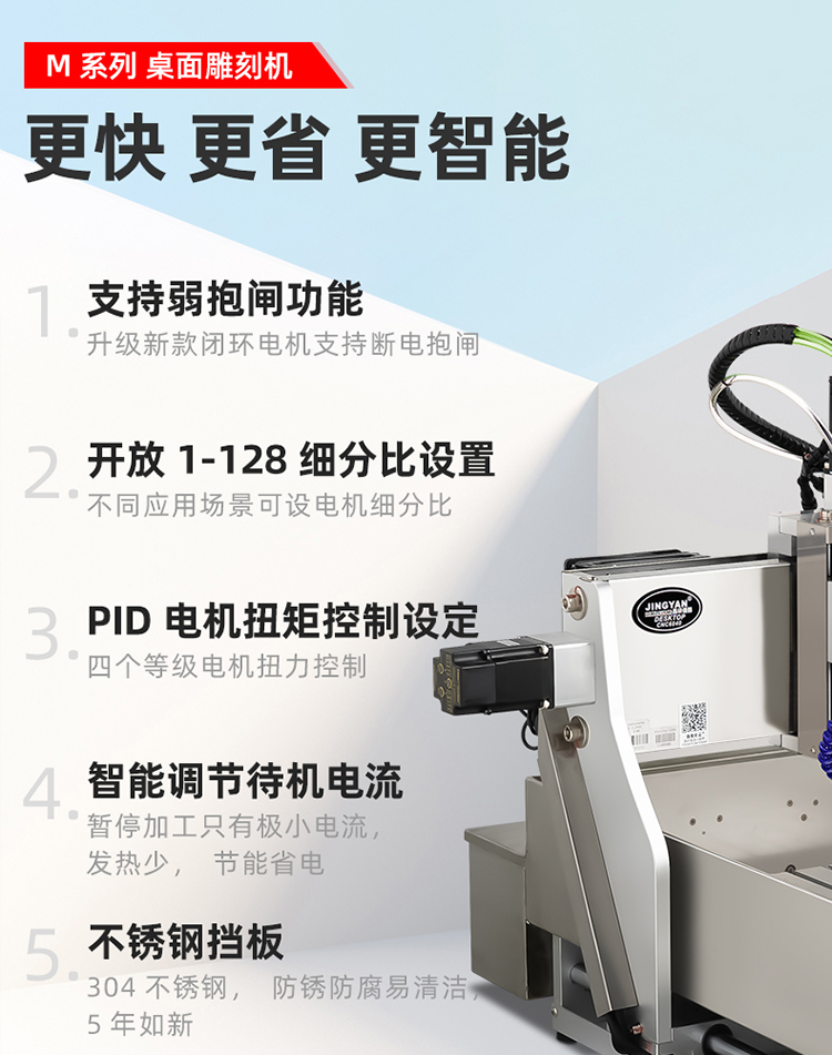 晶研M系列桌面雕刻機提供多種功率選擇,適應(yīng)不同硬度材料加工需求。其高精度編碼限位系統(tǒng)、高速閉環(huán)電機和智能驅(qū)動卡,確保了加工的精度、速度和節(jié)能效果。此外,晶智牛云系統(tǒng)和手機小程序為用戶提供了便捷的教學(xué)和售后服務(wù),使其成為工業(yè)應(yīng)用的理想選擇。