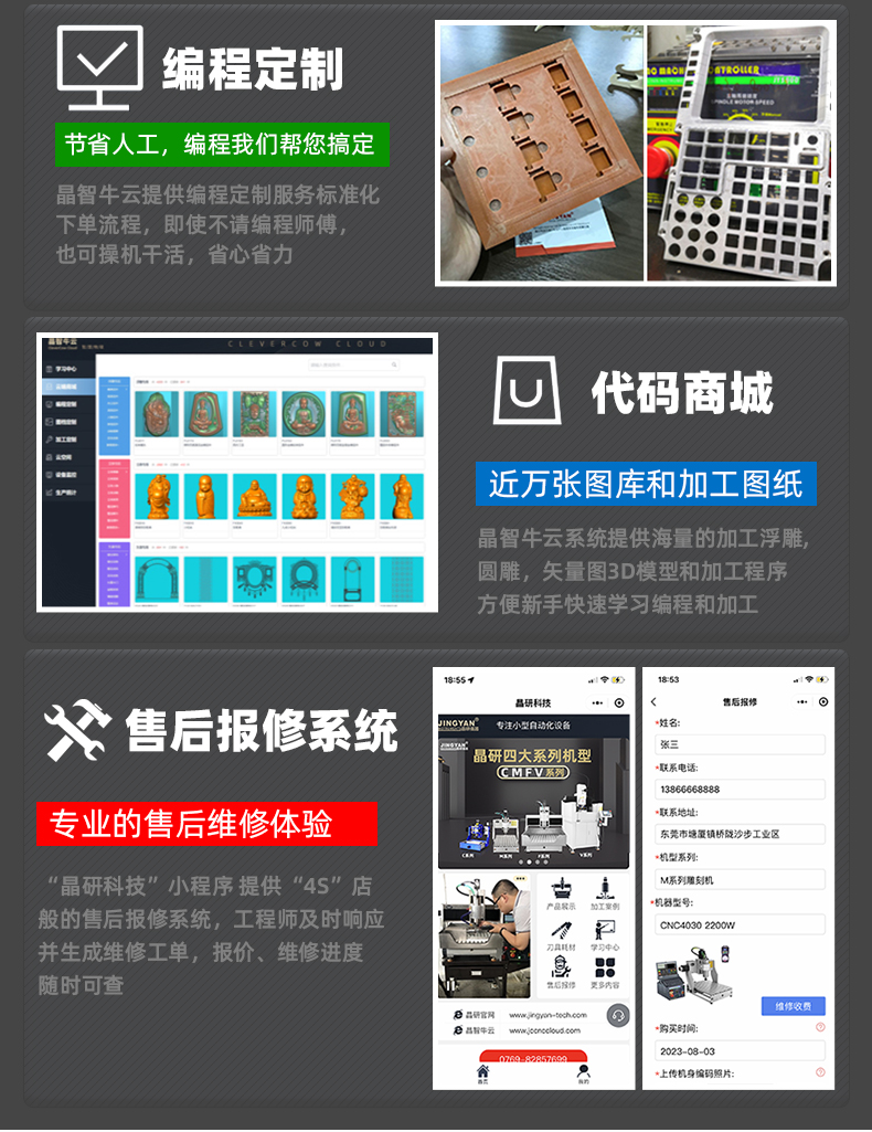 晶研M系列桌面雕刻機提供多種功率選擇,適應不同硬度材料加工需求。其高精度編碼限位系統(tǒng)、高速閉環(huán)電機和智能驅動卡,確保了加工的精度、速度和節(jié)能效果。此外,晶智牛云系統(tǒng)和手機小程序為用戶提供了便捷的教學和售后服務,使其成為工業(yè)應用的理想選擇。