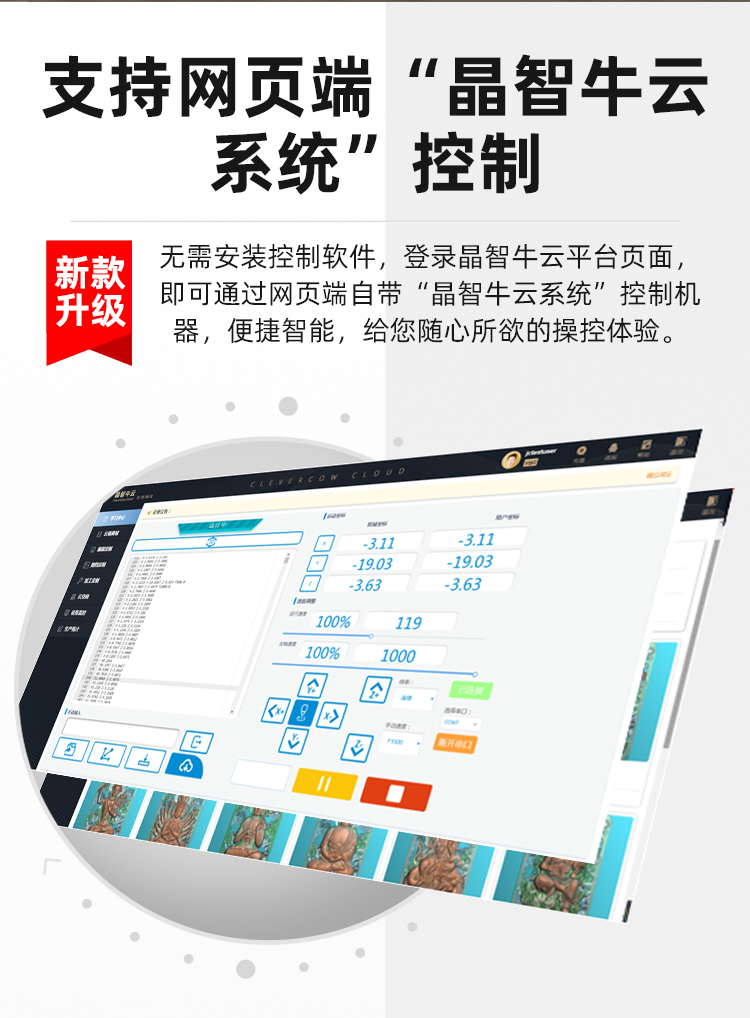 迷你雕刻機(jī)支持一機(jī)多用,多功能數(shù)控雕刻和激光雕刻切換使用,個(gè)性化加工、操作簡(jiǎn)單。無(wú)需安裝控制軟件,登錄晶智牛云平臺(tái)頁(yè)面,即可通過(guò)網(wǎng)頁(yè)端自帶“晶智牛云系統(tǒng)”控制機(jī)
