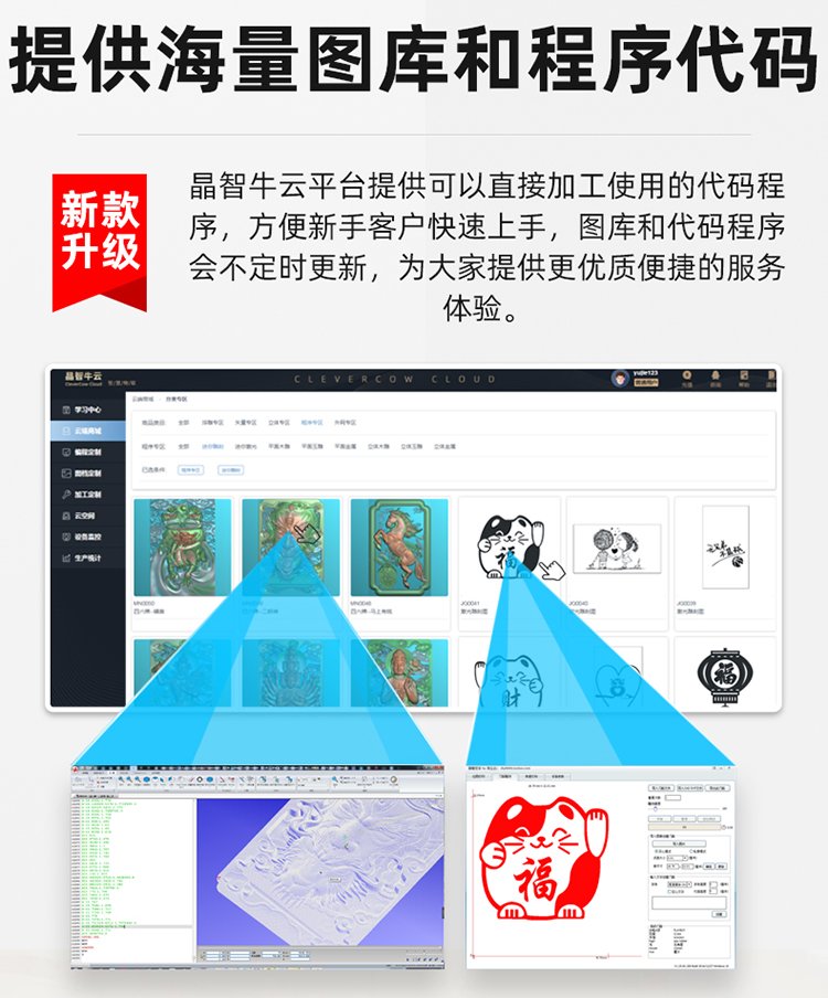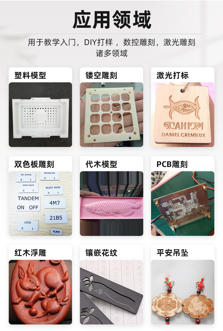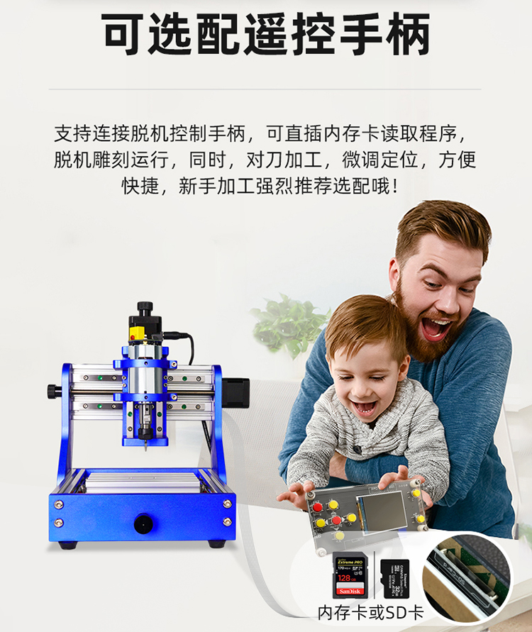 序,方便新手客戶快速上手,圖庫(kù)和代碼程序會(huì)不定時(shí)更新,為大家提供更優(yōu)質(zhì)便捷的服務(wù)體驗(yàn)。支持連接脫機(jī)控制手柄,可直插內(nèi)存卡讀取程序,脫機(jī)雕刻運(yùn)行,同時(shí),對(duì)刀加工,微調(diào)定位,方便快捷,新手加工強(qiáng)烈推薦選配哦!