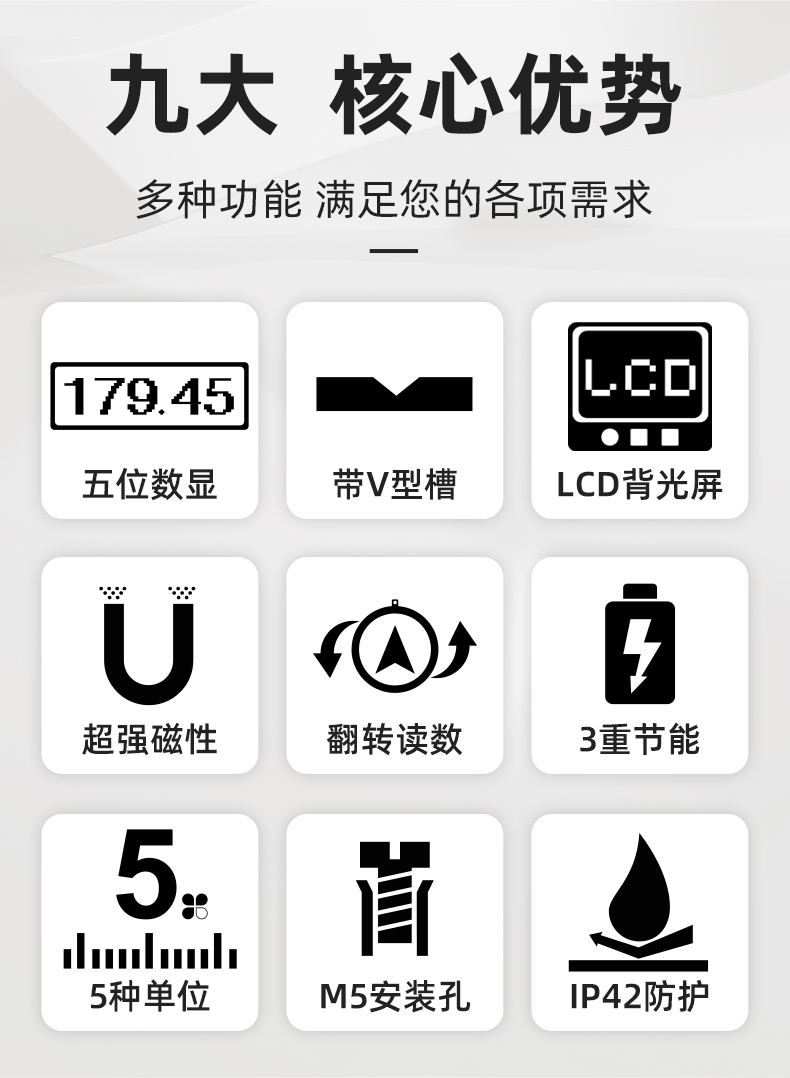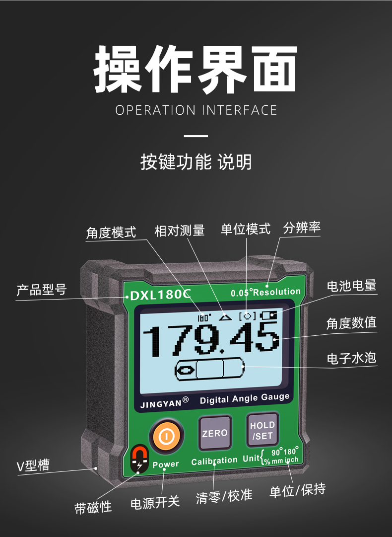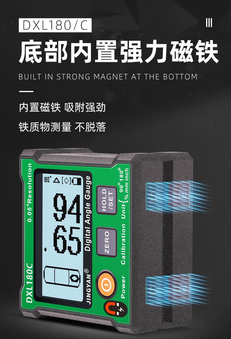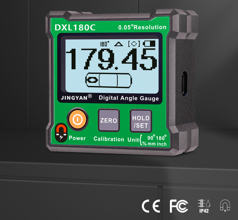 DXL180/C是一款可以使用多種單位顯示的數(shù)字角度儀,支持單位為角度、斜率、英寸和毫米/米的讀數(shù)。測量范圍為2*0-180°和4*0-90°,儀器底部測量面具有強力磁性。V形凹槽設(shè)計便于放置在圓形管上進行測量。支持IP42等級防塵防水,背面預(yù)留M4螺絲孔,方便安裝固定。DXL180/C廣泛應(yīng)用于木工切割、機械制造、裝修設(shè)計、攝影愛好、產(chǎn)品檢測等領(lǐng)域。